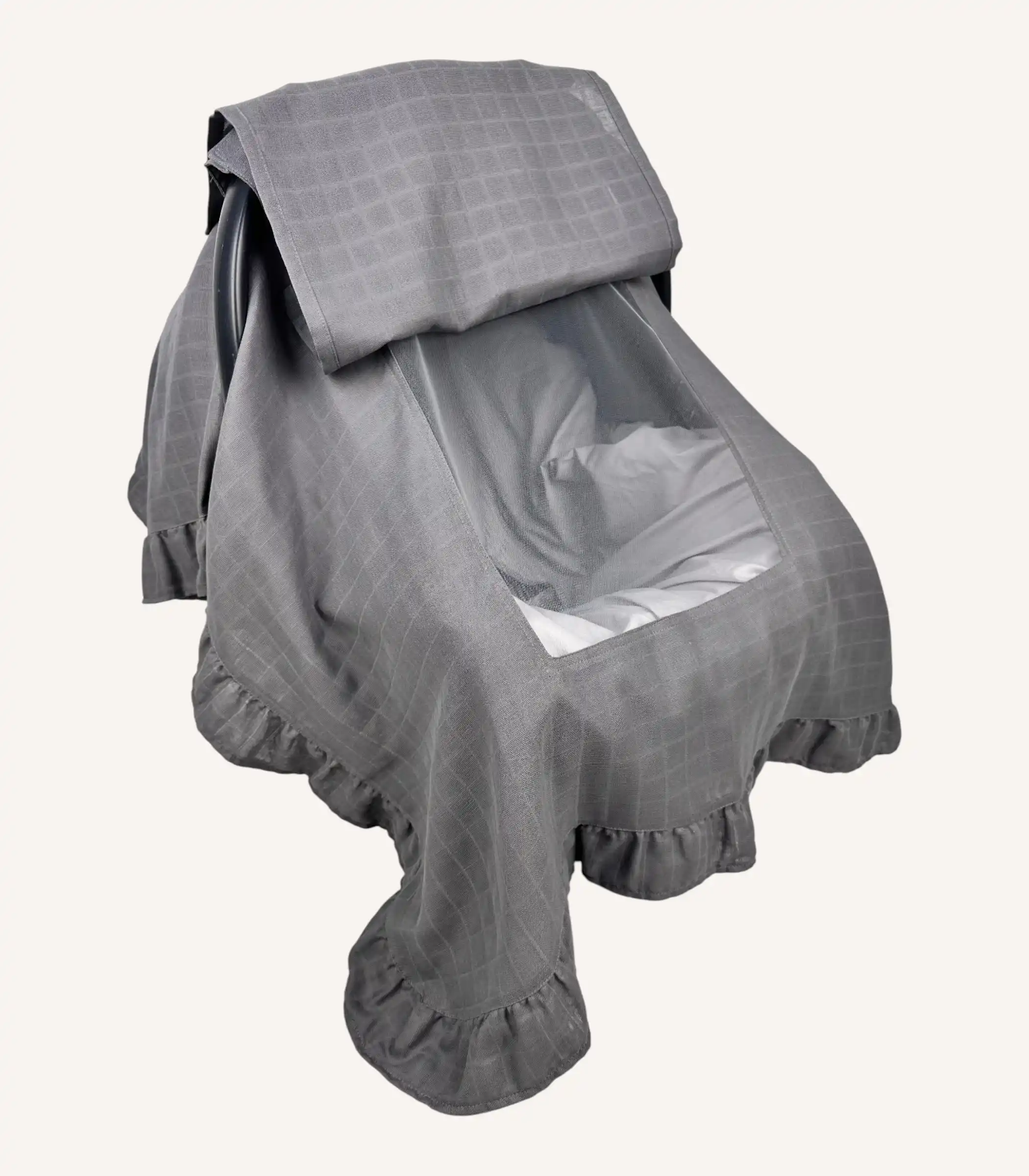 Antrasit tek kat müslin fırfırlı puset örtüsü, hafif ve nefes alabilen pamuk kumaşıyla bebeğinizi güneşten ve dış etkenlerden korur. Tül pencereli tasarımı ve nakış seçeneğiyle modern bir kullanım sunar.