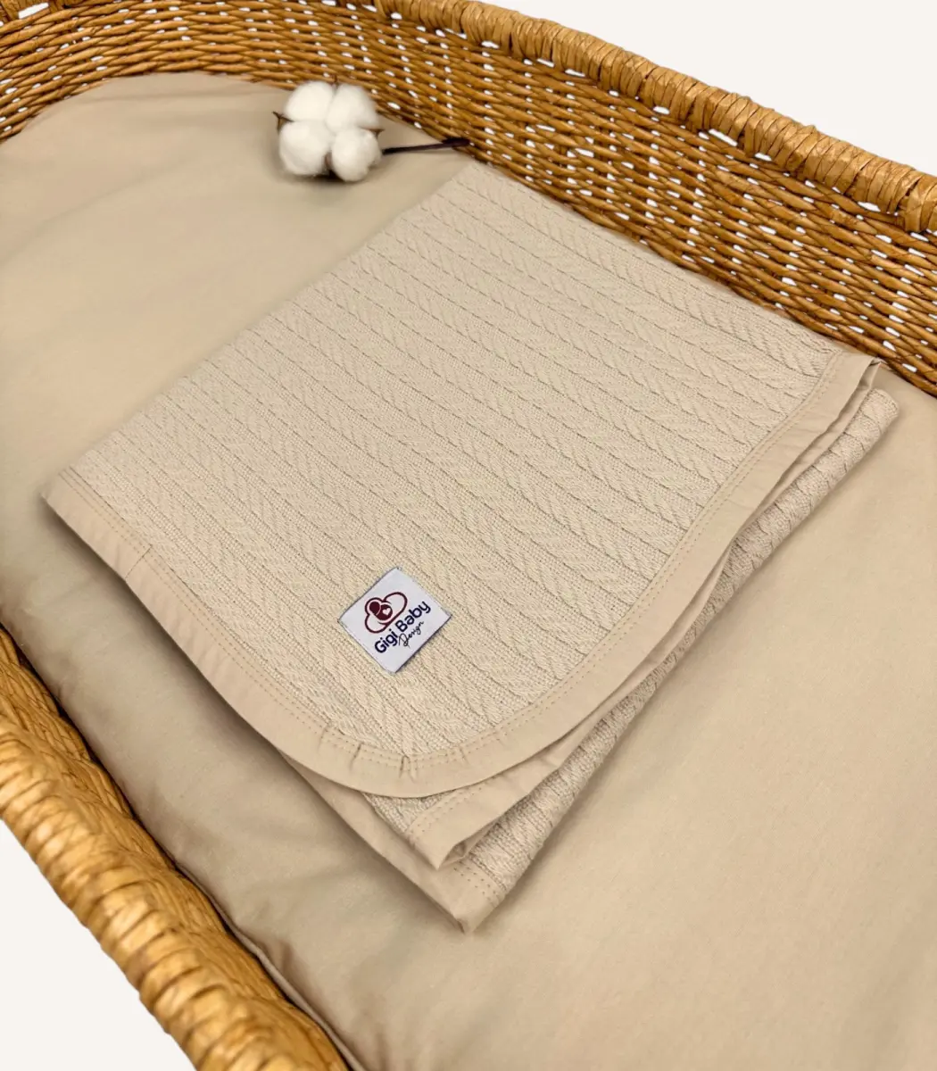Bej Örgü Pike Kumaştan Biyeli Kişiselleştirilebilir Bebek Battaniyesi