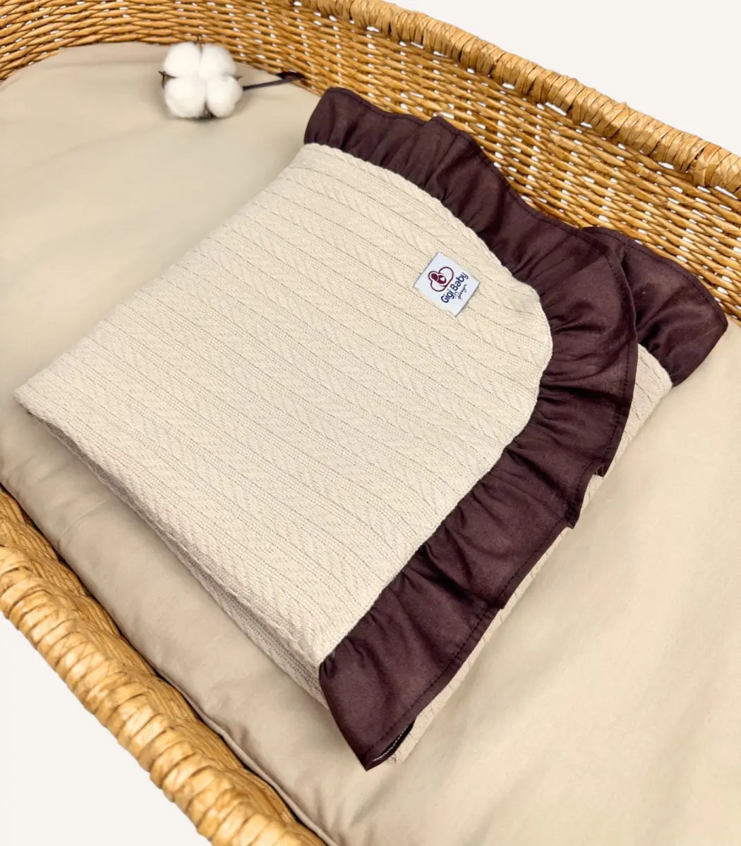Bej Örgü Pike Kumaştan Kahverengi Fırfırlı Kişiselleştirilebilir Bebek Battaniyesi
