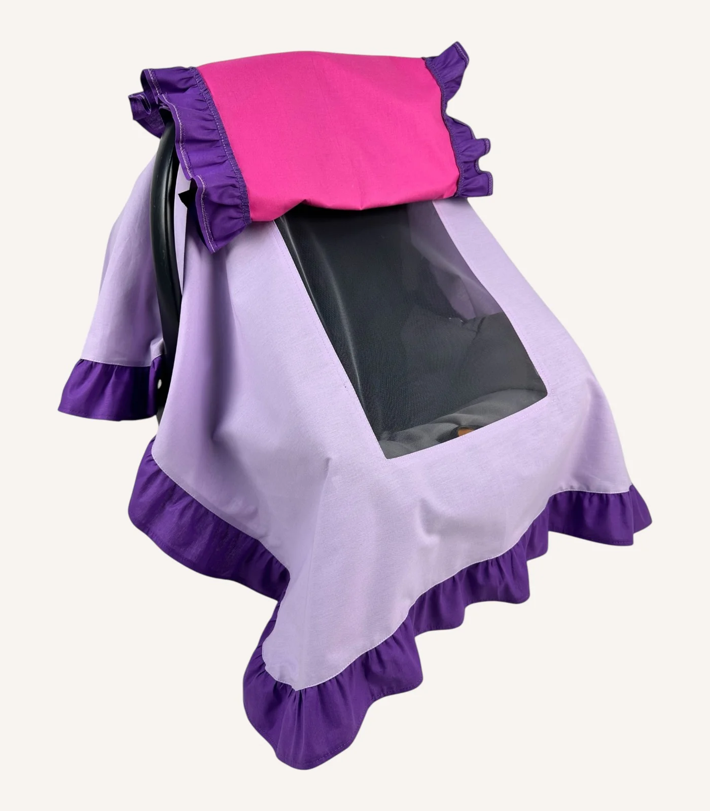 Mor, lila ve fuşya tonlarının uyumuyla hazırlanan %100 pamuk poplin puset örtüsü; fırfırlı kenarları, tül penceresi ve nakış seçeneğiyle koruma ve zarafet sunar.