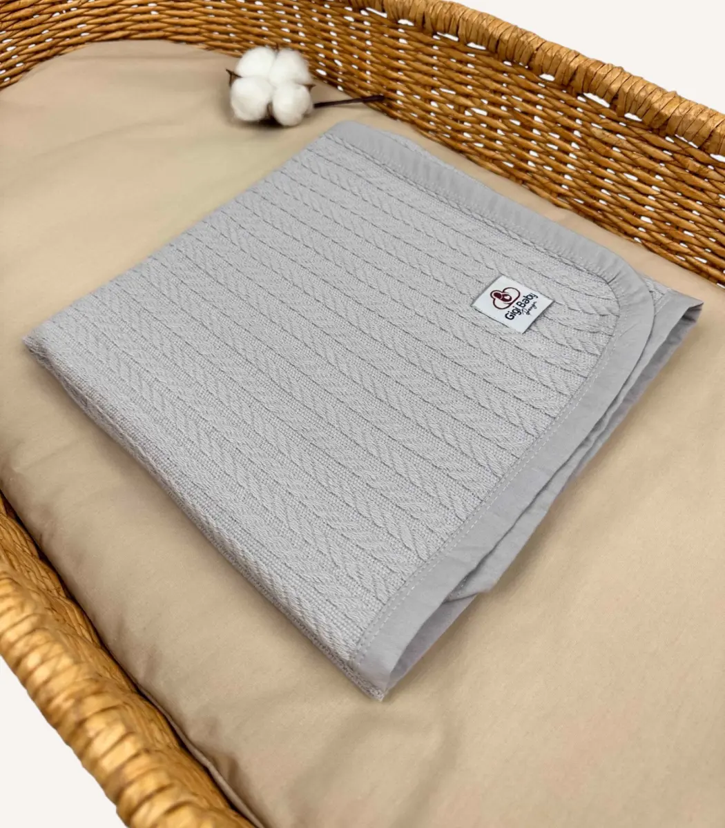 Gri Örgü Pike Kumaştan Biyeli Kişiselleştirilebilir Bebek Battaniyesi