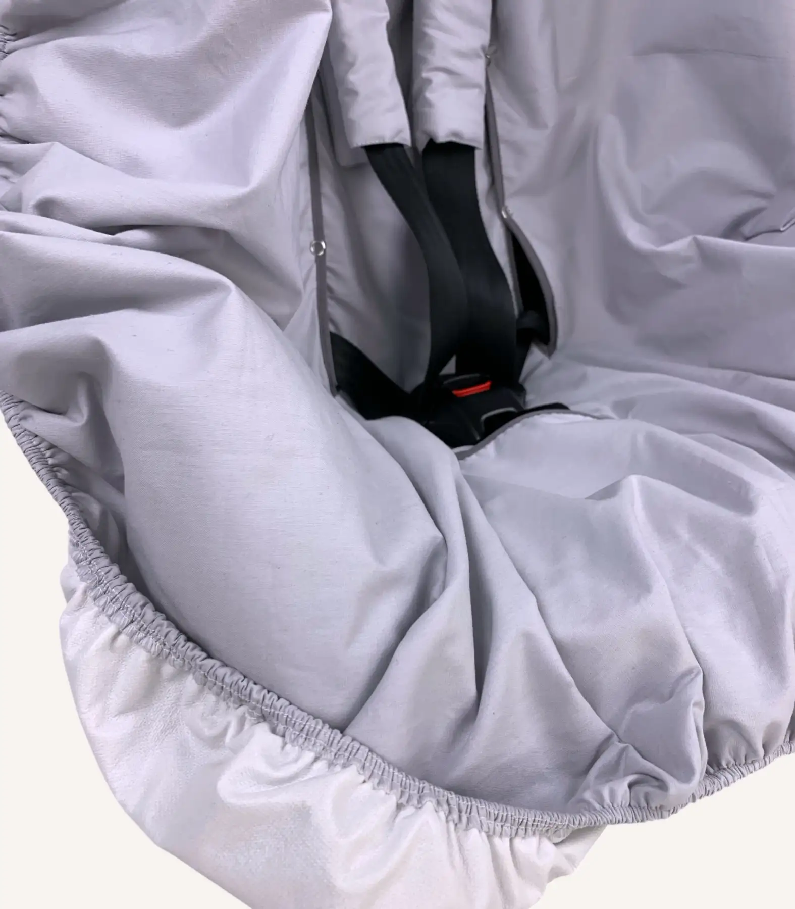 Gri oto koltuğu kılıfı ve kemer kılıfı, pamuk temas yüzeyi ve alezli/alezsiz seçenekleriyle hijyen ve konfor sağlar. Çıtçıtlı tasarımı sayesinde kolayca takılır. Nakış ile kişiselleştirilebilir.