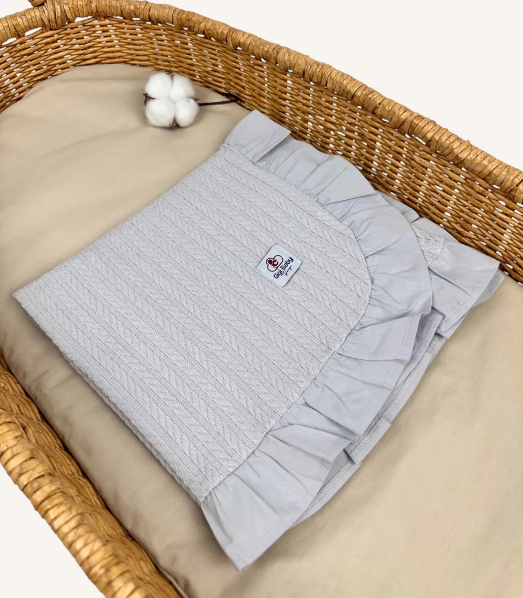 Gri Örgü Pike Kumaştan Fırfırlı Kişiselleştirilebilir Bebek Battaniyesi