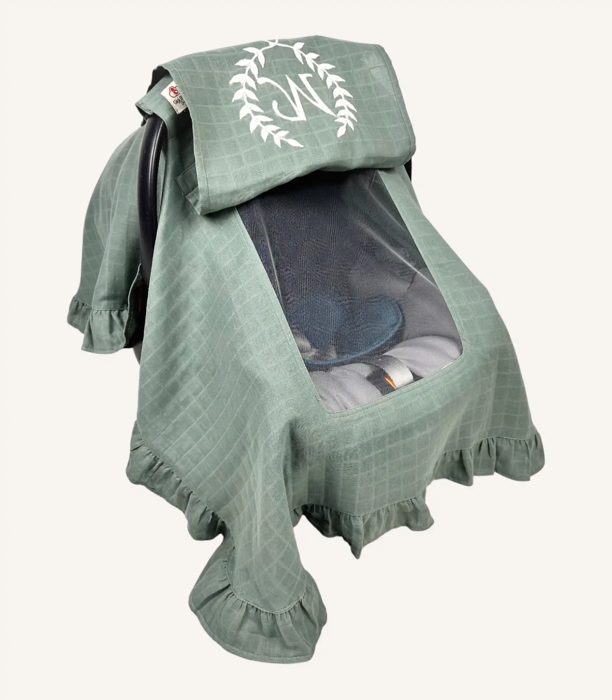 Haki tek kat müslin fırfırlı puset örtüsü, hafif ve nefes alabilen pamuk kumaşıyla bebeğinizi güneşten ve dış etkenlerden korur. Tül pencereli tasarımı ve nakış seçeneğiyle doğal bir kullanım sunar.