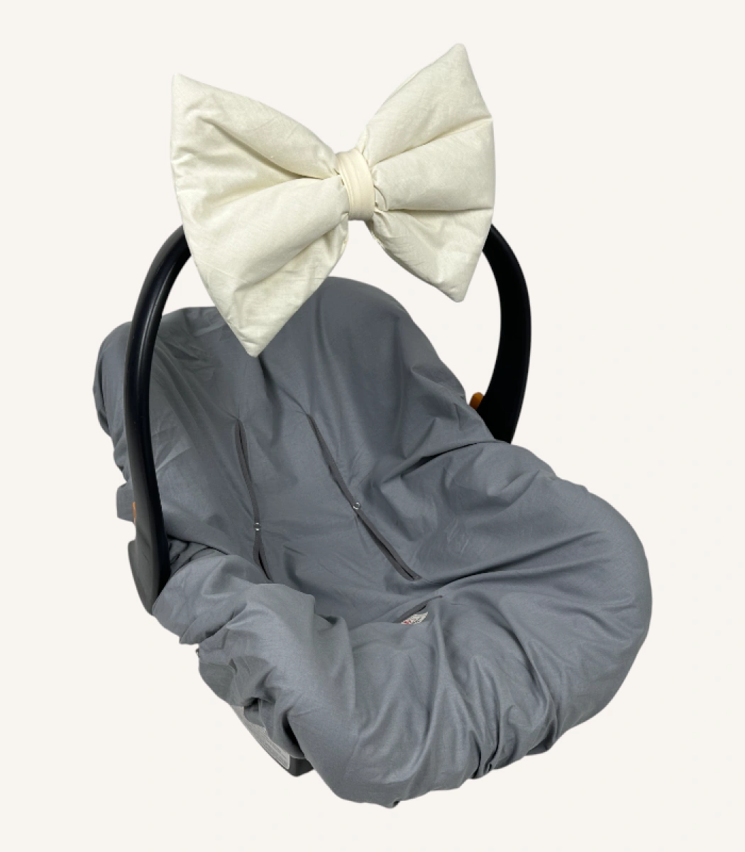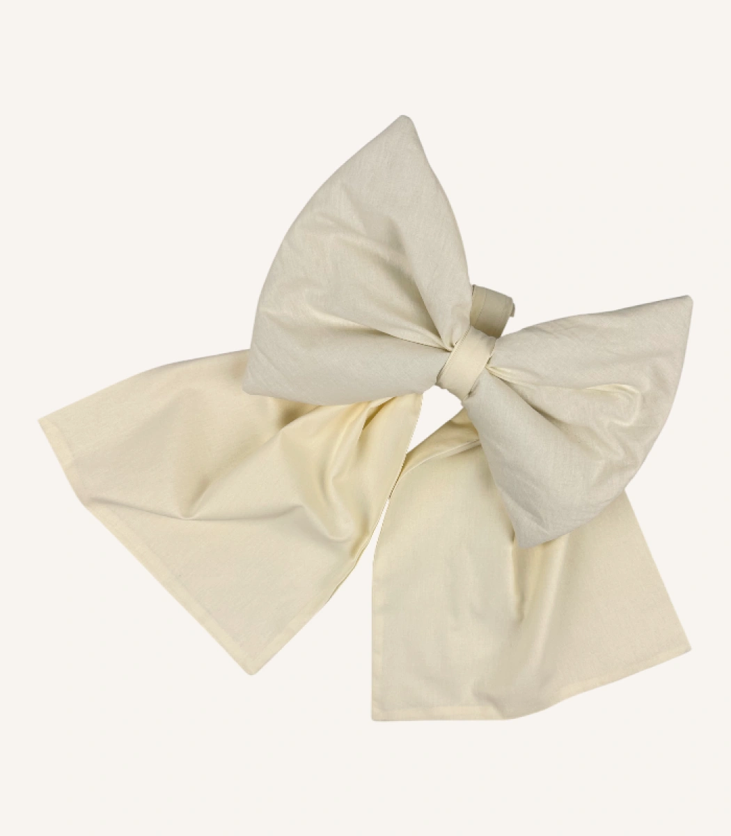 Krem pamuk fiyonk aksesuar; cırt veya broş aparatıyla kolayca sabitlenir. Kuyruklu modelde nakış seçeneği sunar ve ortama yumuşak bir dokunuş katar.