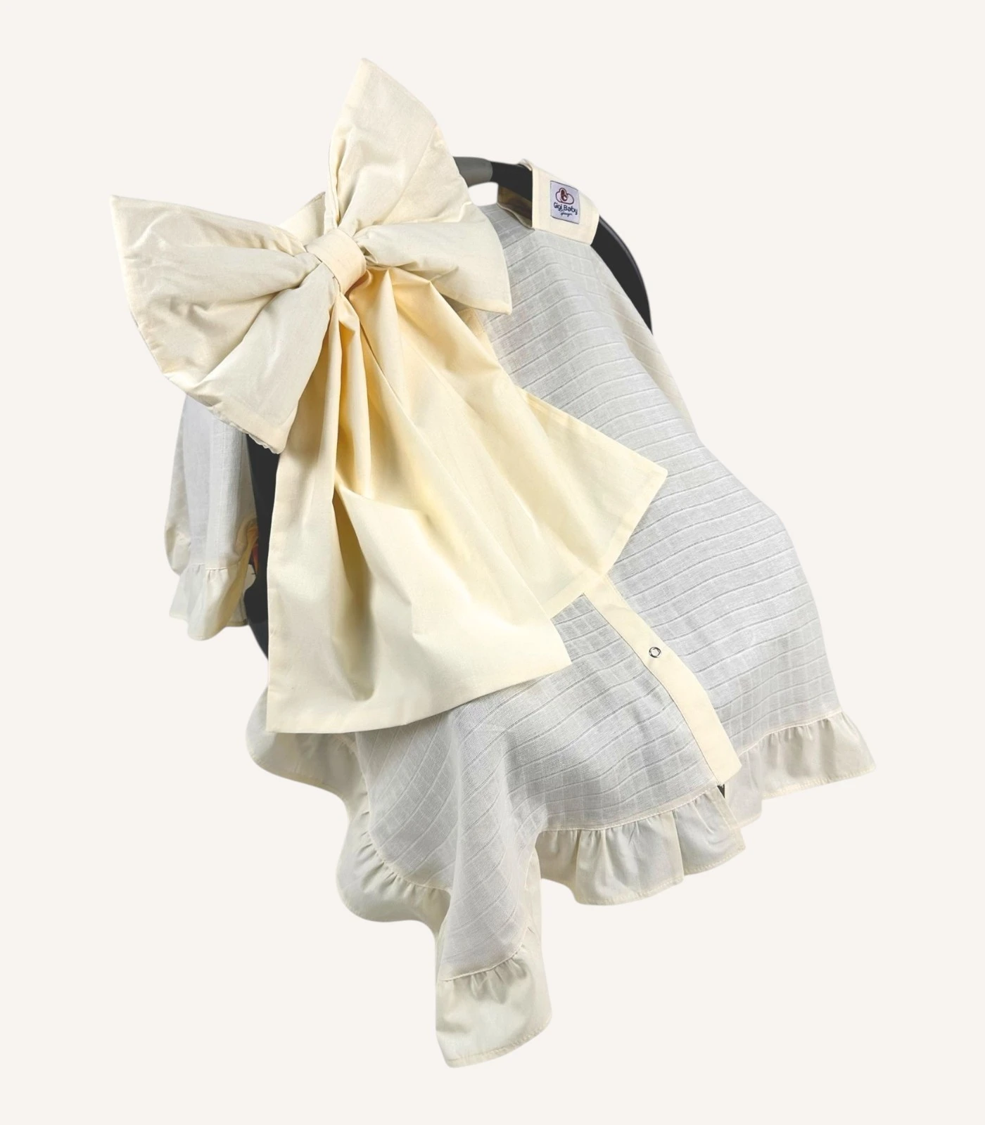 Krem müslin fiyonklu yırtmaçlı puset örtüsü, hafif ve ince yapısıyla sıcak havalar için ideal bir puset örtüsü sunar. Ayrıca nefes alabilen tek kat %100 pamuk müslin kumaşı hava dolaşımını destekler, böylece puset içinde ferah bir ortam oluşur. Bununla birlikte örtü rüzgarı dengeler, güneş ışığını yumuşatır ve toz gibi dış etkenlerin etkisini azaltır. Aynı zamanda bebeğinizle doğrudan teması sınırlar ve daha korunaklı bir alan oluşturur. Böylece özellikle yaz aylarında ve mevsim geçişlerinde konforlu bir kullanım elde edersiniz.