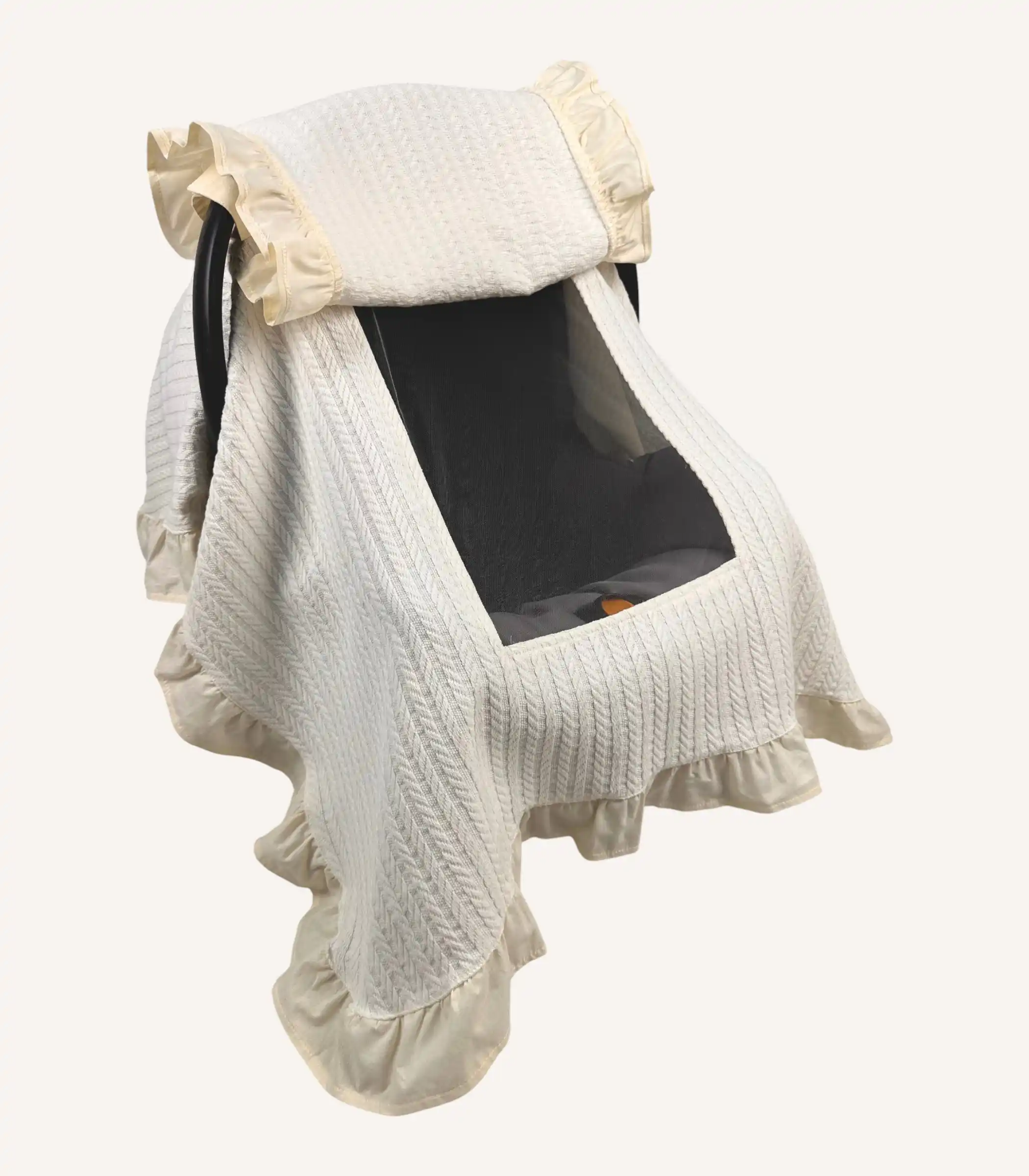 Krem Örgü Pike Fırfırlı Kapaklı Puset Örtüsü