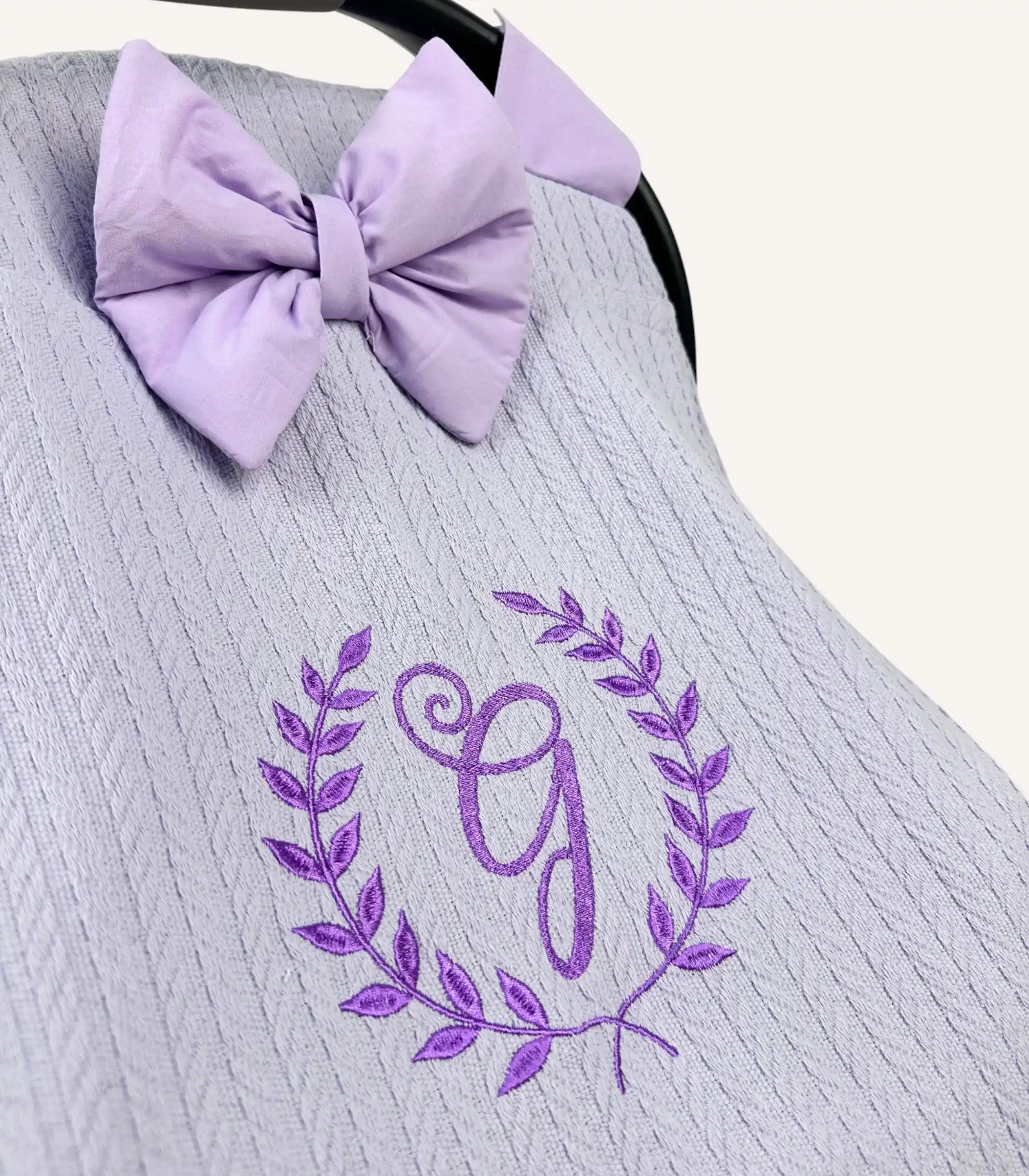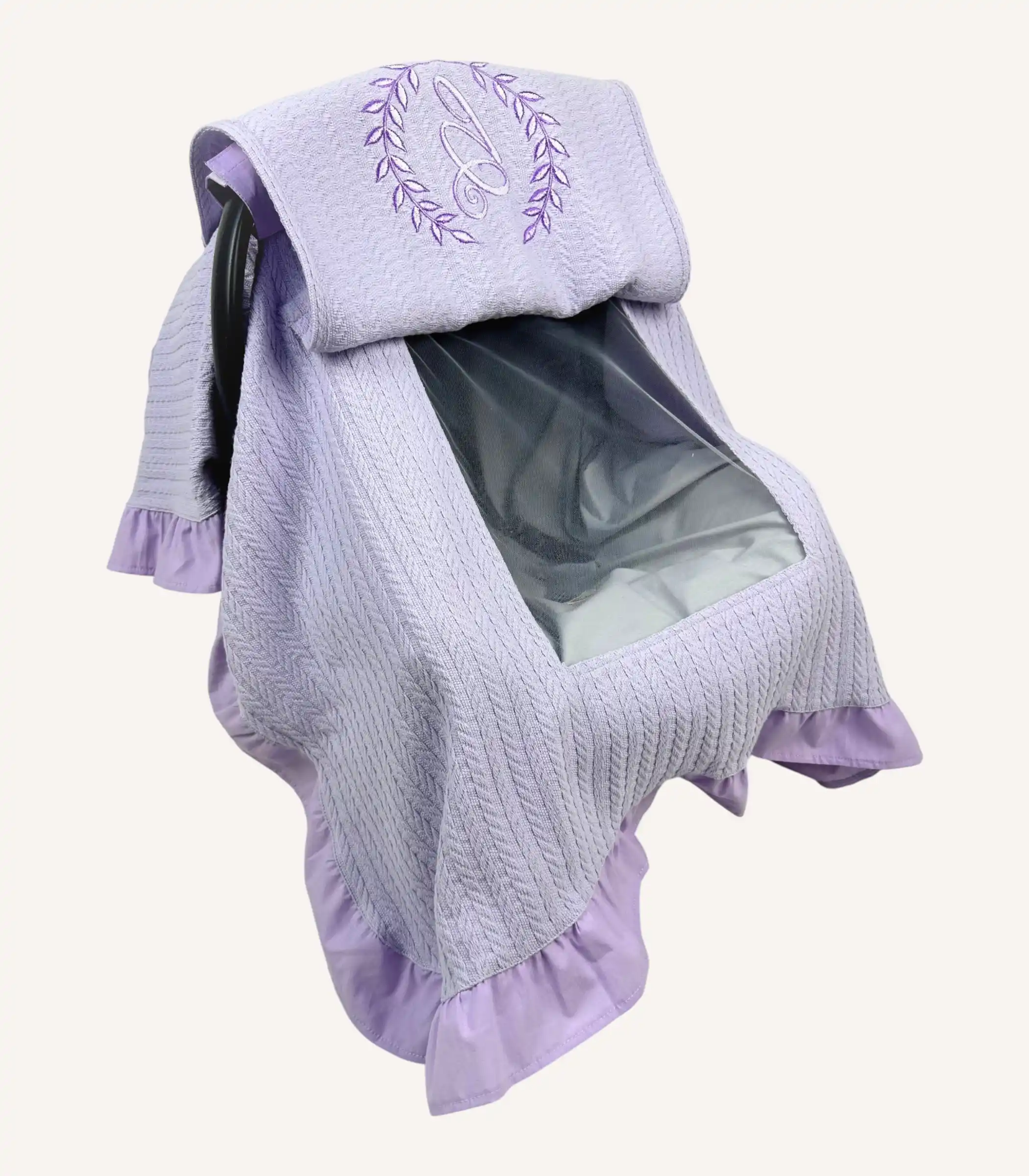 Lila örgü pike fırfırlı puset örtüsü, yumuşak dokusu ve zarif görünümüyle bebeğiniz için konforlu ve şık bir kullanım sağlar.
