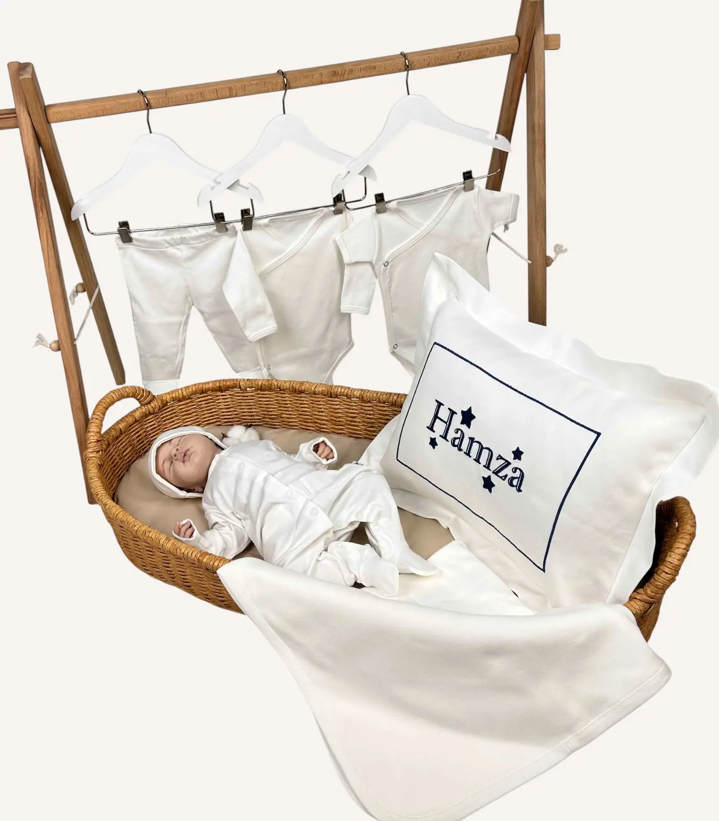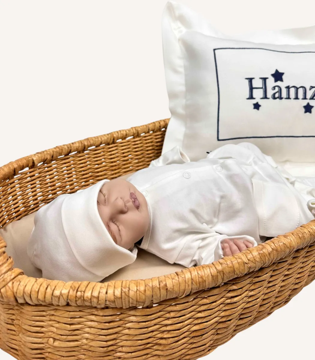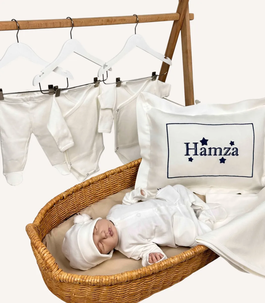 Set içinde yer alan dekoratif yastık, battaniye, tulum ve şapka üzerine isim veya monogram işliyoruz. Üstelik 4 parçaya kadar nakışı fiyata ek ücret yansıtmadan sunuyoruz. Sipariş sırasında yazı tipi ve nakış rengini seçerek tasarımı tamamen kişisel hâle getirebilirsiniz. Böylece hem anlamlı hem de özel bir hatıra oluşturursunuz.