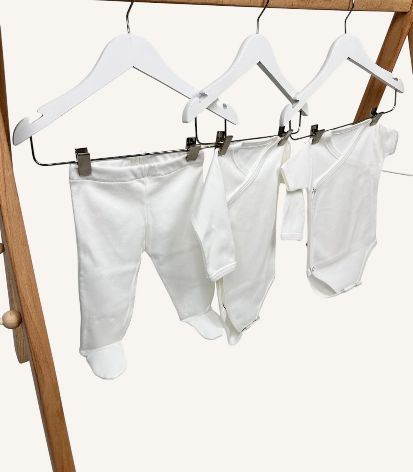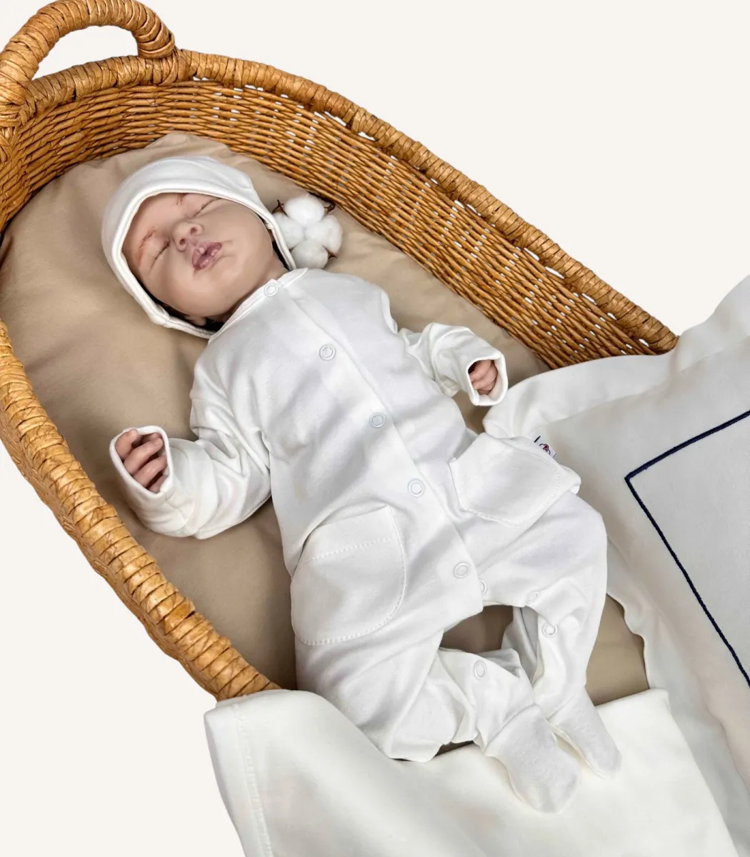Ekru GOTS sertifikalı organik kumaştan üretilmiş 7’li hastane çıkış seti; 4 parçaya kadar nakış seçeneği ve yenidoğan cildine dost premium materyalleriyle zarif bir başlangıç sunar.