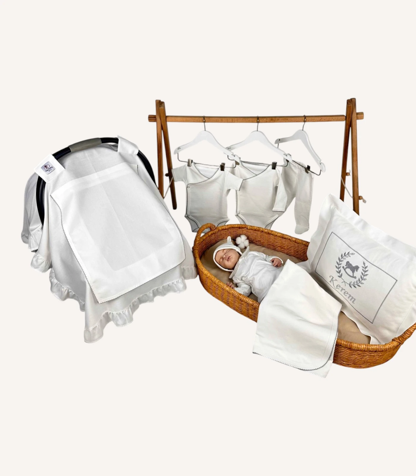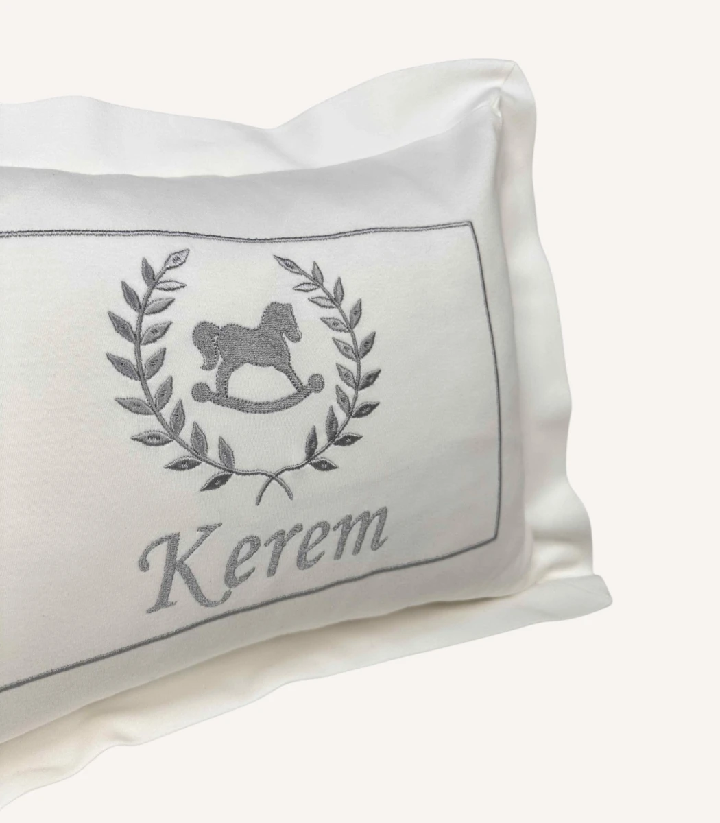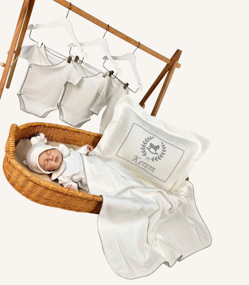 Dekoratif yastık, battaniye, tulum ve puset örtüsü üzerine isim veya monogram işliyoruz. Üstelik 4 parçaya kadar nakışı hediye olarak sunuyoruz. Sipariş sırasında yazı tipi, nakış rengi ve tasarım (desen) seçimini belirleyerek seti tamamen bebeğinize özel hâle getirebilirsiniz. Böylece hem anlamlı hem de özel bir hatıra oluşturursunuz.