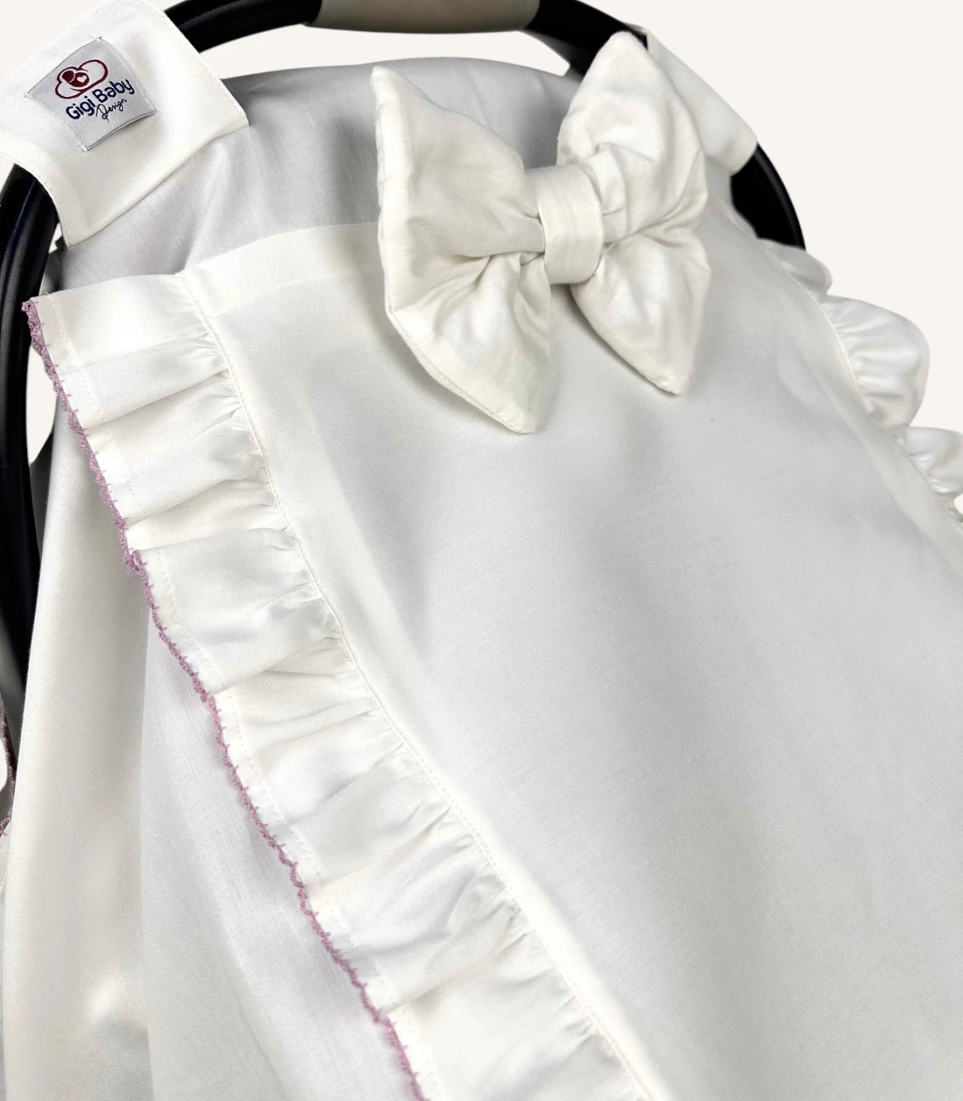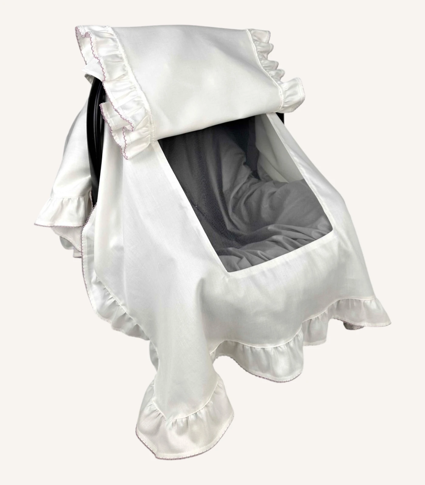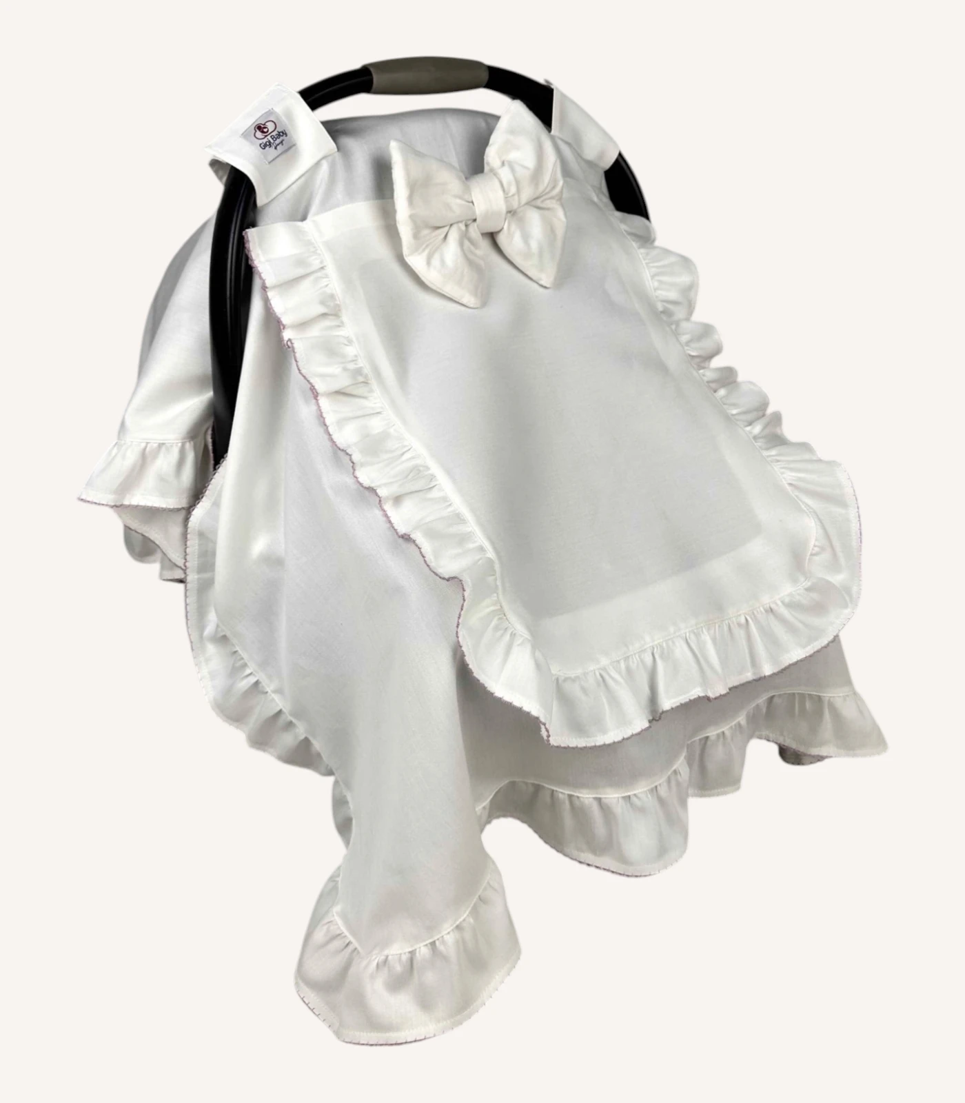 Sete dahil puset örtüsünü %100 pamuk saten kumaş kullanarak hazırlıyoruz. Kenar ve kapak bölümünde yer alan fırfır ve kroşe işlemeler örtüye zarif bir görünüm kazandırır. Aynı zamanda yumuşak ve pürüzsüz yüzeyi bebeğiniz için konforlu bir kullanım sunar.
