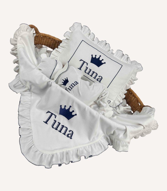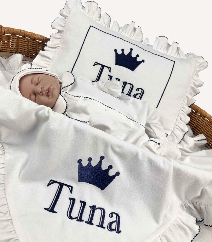 Dekoratif yastık, battaniye, tulum ve puset örtüsü üzerine isim veya monogram işliyoruz. Üstelik 4 parçaya kadar nakışı hediye olarak sunuyoruz. Sipariş sırasında yazı tipi, nakış rengi ve tasarım (desen) seçimini belirleyerek seti tamamen bebeğinize özel hâle getirebilirsiniz. Böylece hem anlamlı hem de özel bir hatıra oluşturursunuz.