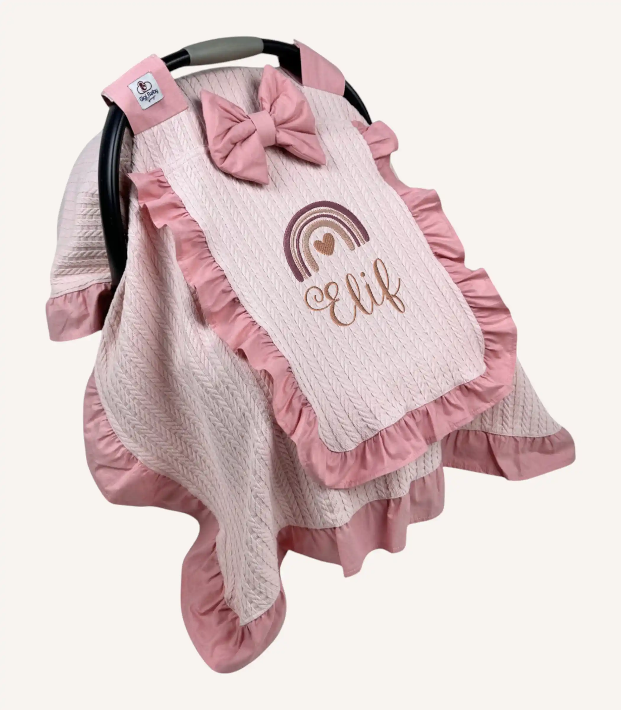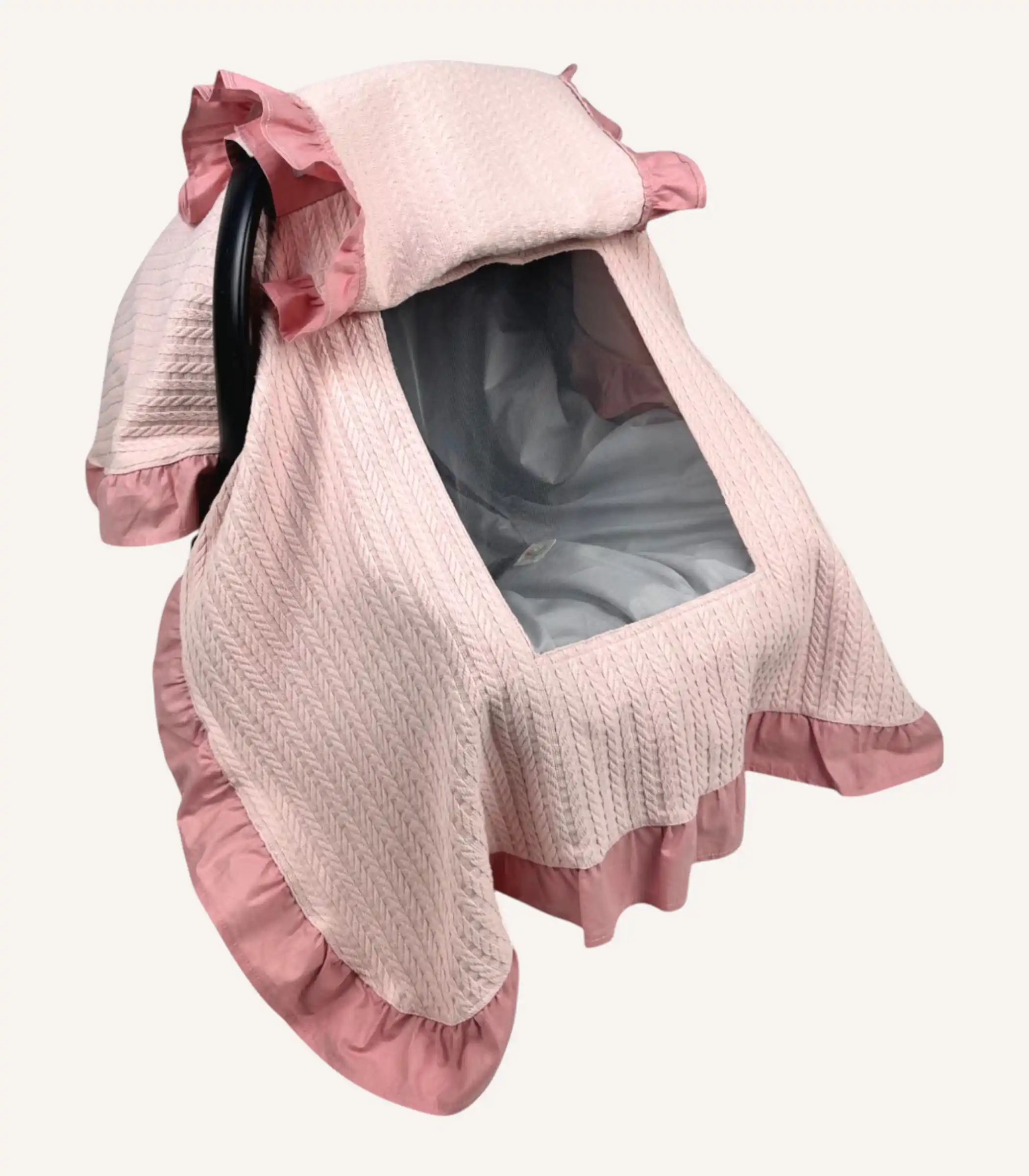 Pudra örgü pike kapaklı puset örtüsü, pamuklu yapısı ve tül pencereli tasarımıyla bebeğinizi rüzgâr ve dış etkenlerden korur. İsim nakışı ile kişiselleştirilebilir, yumuşak ve zarif bir kullanım sunar.