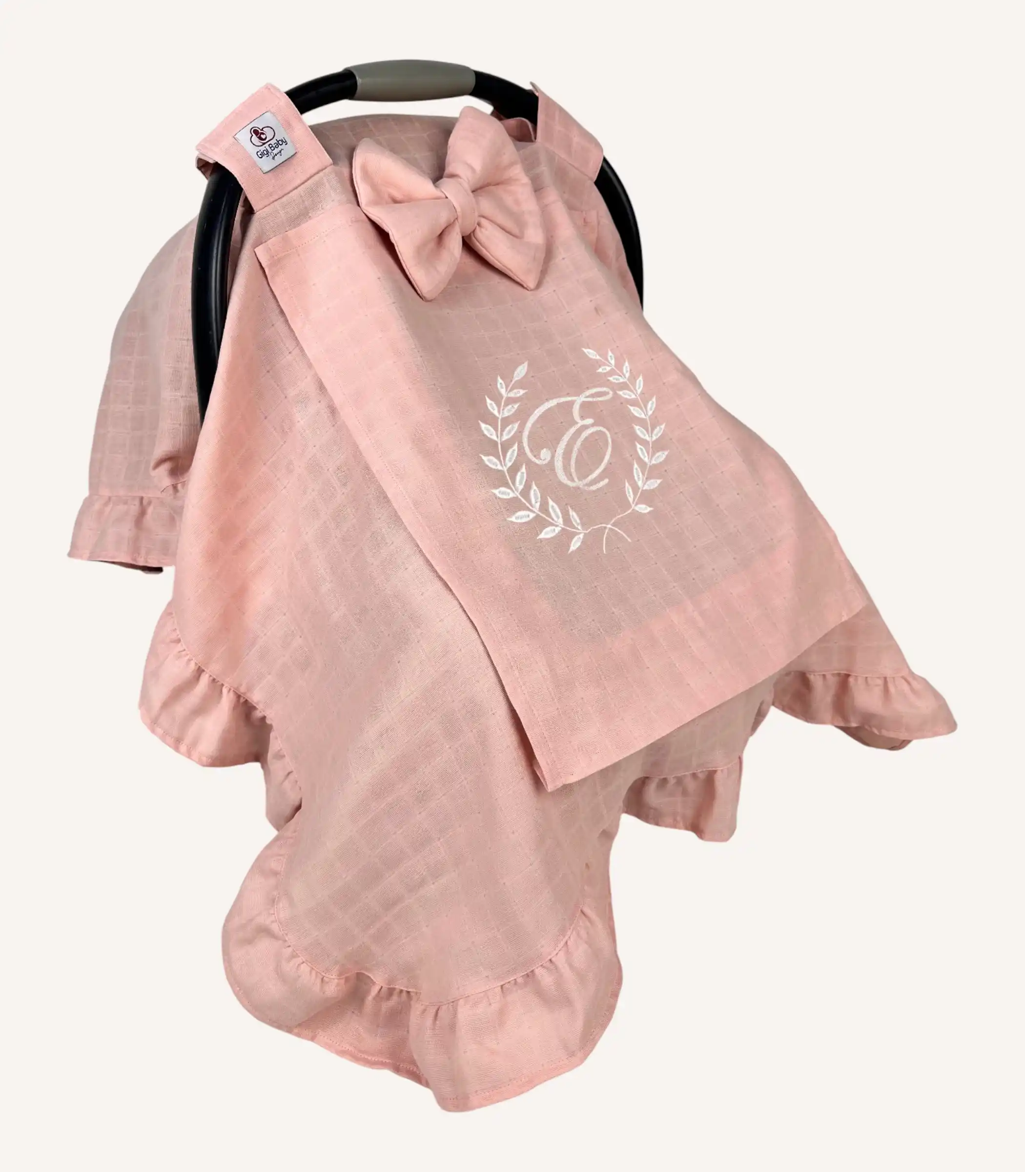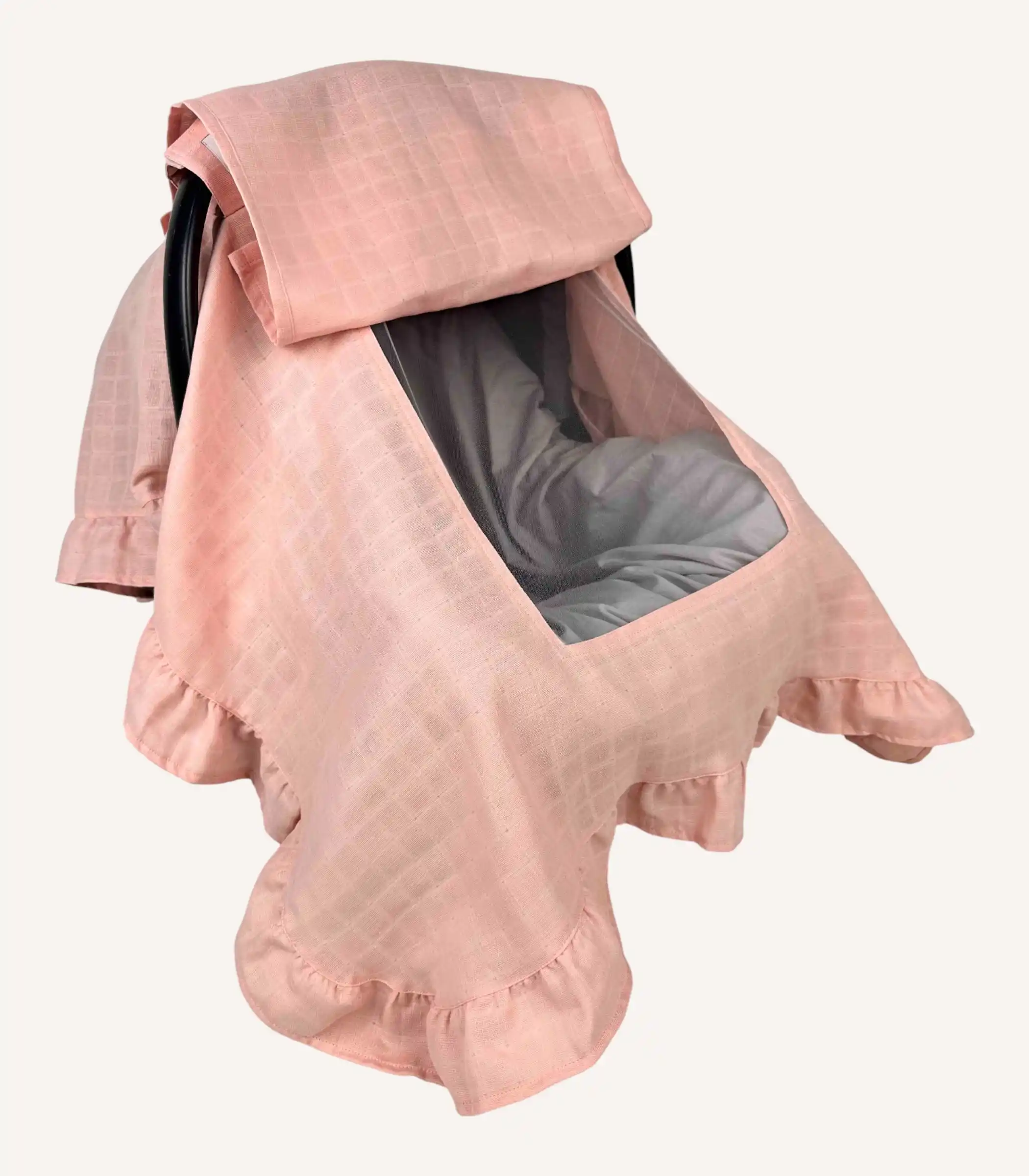 Pudra tek kat müslin fırfırlı puset örtüsü, hafif yapısı ve yumuşak dokusuyla bebeğiniz için konforlu bir kullanım sağlar.