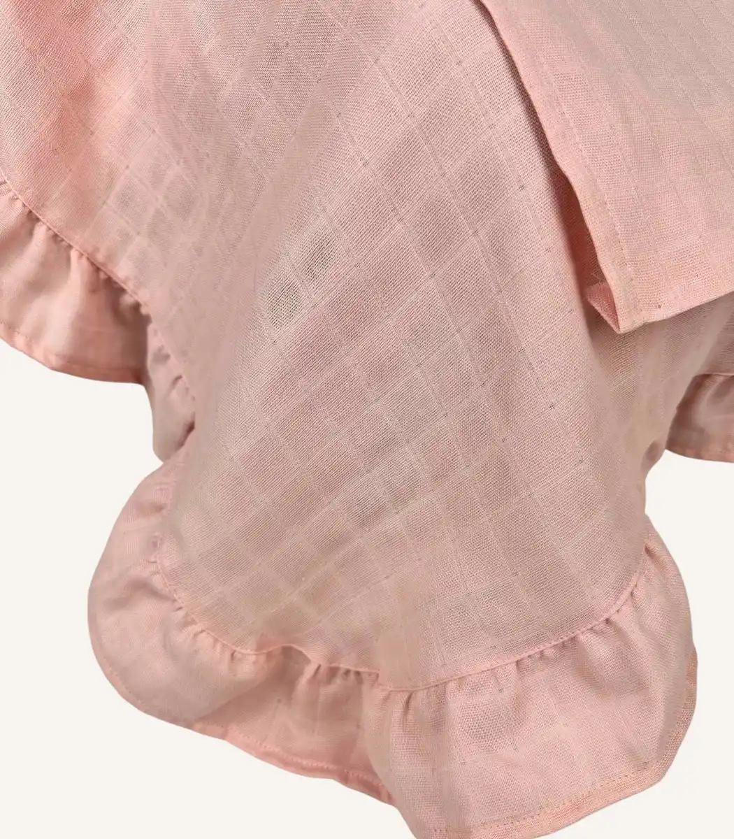 Pudra tek kat müslin fırfırlı puset örtüsü, hafif dokusu ve yumuşak rengiyle bebeğiniz için konforlu bir kullanım sunar.