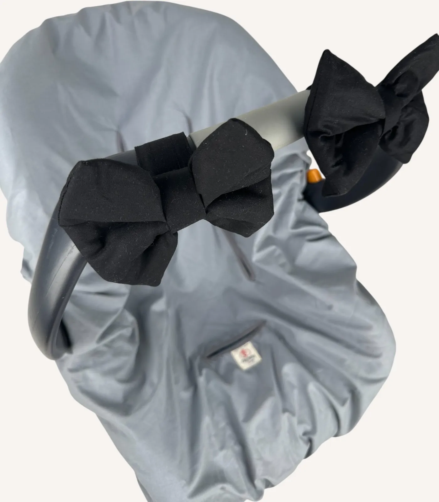 Siyah renkte iki adet mini pamuk fiyonk. Cırt veya broş aparatıyla sabitlenir ve ortama güçlü, modern bir dokunuş katar.